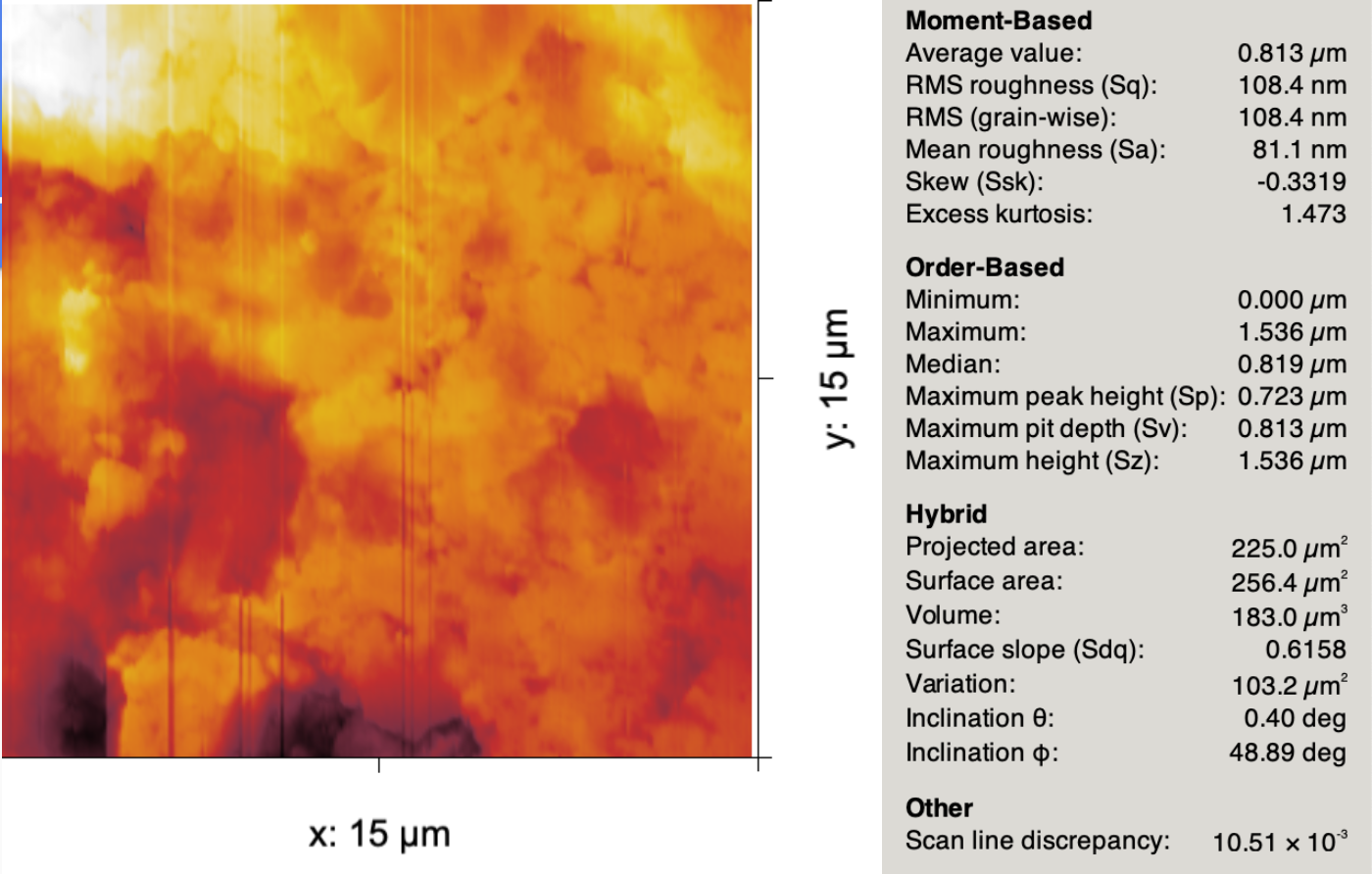 The cross-sectional surface area (needed to calculate conductivity) was found using ImageJ and given in the below table. The diameter of all pellets was approximately 11.9mm, but the electrode contact area was slightly smaller to avoid creating a short circuit along the sides of the pellet. To obtain the adjusted sample-electrode contact surface area, the average of the top and bottom electrode surface area was multiplied by the specific surface area as obtained from several AFM micrographs of the heat-treated pellet samples. On average, the ratio of the planar surface area to the AFM-measured surface area was about $1.12$. An example of the values reported by Gwyddion for an AFM image is shown below.